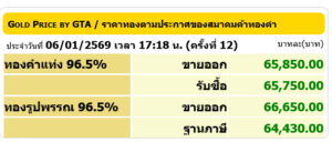 สรุปราคาทองวันนี้ 6 มกราคม 2569 หลังเช้านี้ สมาคมค้าทองคำ ประกาศราคาทองครั้งที่ 1 (เปิดตลาด) เมื่อเวลา 09.04 น. ปรับตัวเพิ่มขึ้น 50 บาท สู่บริเวณ 65,750 บาท โดยตลอดทั้งวัน ราคาทองปรับขึ้นลงทั้งหมด 12 ครั้ง รวมแล้ว ปรับขึ้น 150 บาท ซึ่งผิดคาดเนื่องจากเช้านี้มีการปรับขึ้นพรวดทีเดียว 3 ครั้ง