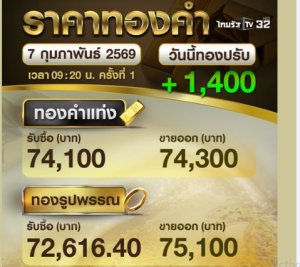 ราคาทองวันนี้ 7 กุมภาพันธ์ 2569 ประกาศครั้งเดียว เมื่อเวลา 09.20 น. ปรับตัวเพิ่มขึ้นพรวดเดียว 1,400 บาท สู่บริเวณ 74,300 บาท
