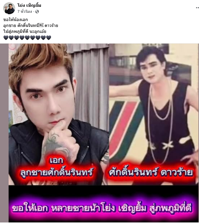 สร้างความเศร้าให้กับคนในวงการบันเทิงไม่น้อยเมื่อตลกชื่อดัง โย่ง เชิญยิ้ม ได้โพสต์ข้อความอาลัยต่อการจากไปของหลานชาย ซึ่งเป็นบุตรของ ศักดิ์นรินทร์ ดาวร้าย หรือ สมศักดิ์ จันทร์วิไล ตำนานลิเกชื่อดังแห่งจังหวัด พิษณุโลก