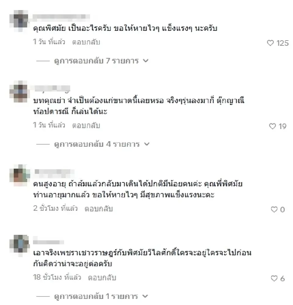 ทั้งนี้ค่ะก็มีคนเข้ามาตอบถึงสาเหตุ พิศมัย วิไลศักดิ์ นั่งรถวีลแชร์ว่าเป็นเพราะ หกล้มทำให้เดินแบบขัดๆ จึงต้องนั่งรถเข็น ท่ามกลางแฟนๆที่เข้ามาแสดงความห่วงใยกันเพียบ