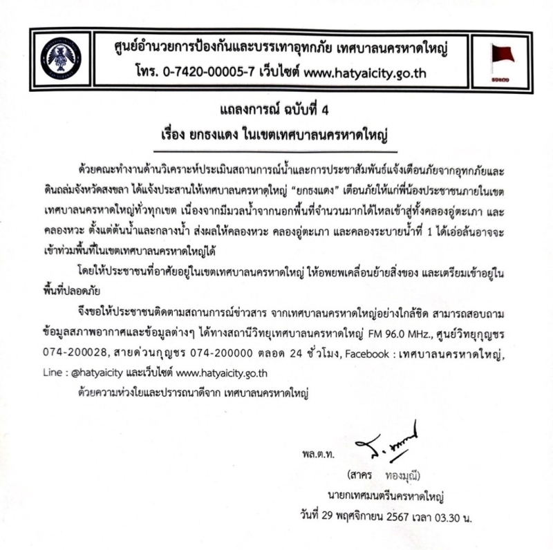 เมื่อวันที่ 22 พฤศจิกายน 2568 เพจ เทศบาลนครหาดใหญ่ ได้โพสต์แถลงการณ์การณ์เกี่ยวกับสถานการณ์น้ำท่วมในพื้นที่ ระบุว่า แถลงการณ์ฉบับที่ 4 เรื่อง ยกธงแดง ในเขตเทศบาลนครหาดใหญ่ เนื่องจากมีมวลน้ำจากนอกพื้นที่จำนวนมากได้ไหลเข้าสู่ ทั้งคลองอู่ตะเภา และคลองหวะ ตั้งแต่ต้นน้ำและกลางน้ำ ส่งผลให้คลองหวะ คลองอู่ตะเภา และคลองระบายน้ำที่ 1 ได้เอ่อล้น อาจจะเข้าท่วมพื้นที่ในเขตเทศบาลนครหาดใหญ่ได้ โดยให้ประชาชนที่อาศัยในเขตเทศบาลนครหาดใหญ่ ให้อพยบเคลื่อนย้ายสิ่งของและเตรียมเข้าอยู่ในพื้นที่ปลอดภัย
