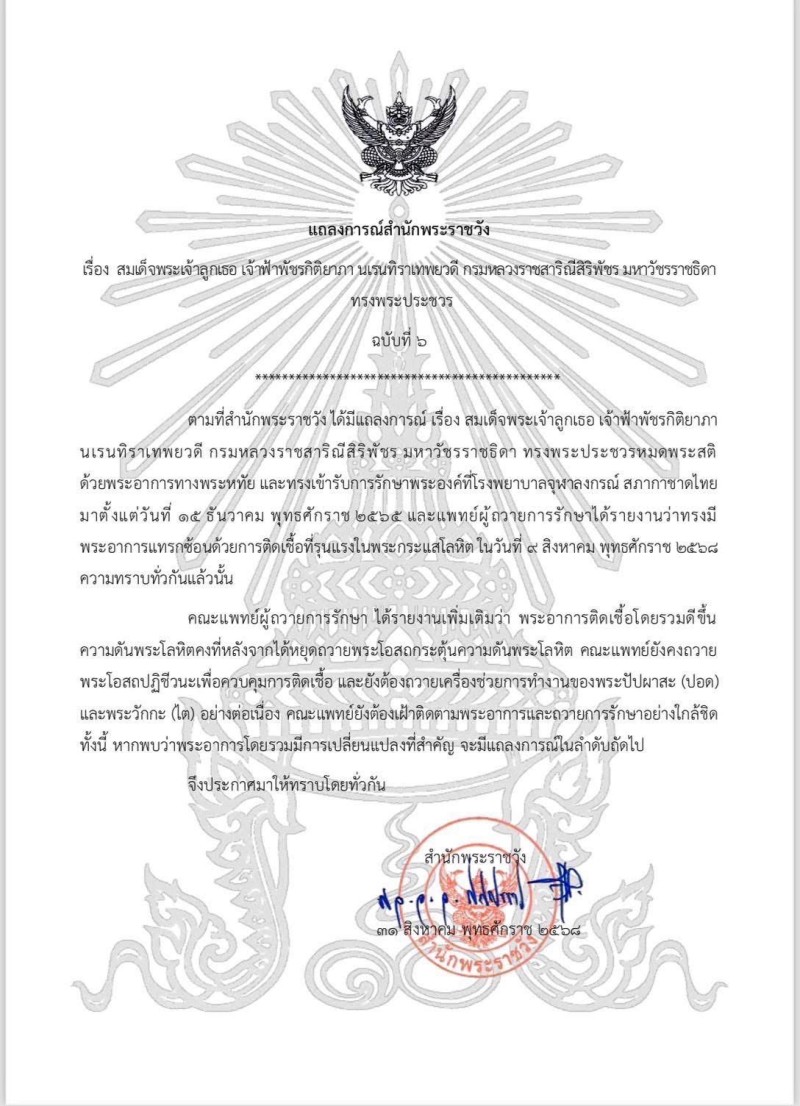 ตามที่สำนักพระราชวัง ได้มีแถลงการณ์ เรื่อง สมเด็จพระเจ้าลูกเธอ เจ้าฟ้าพัชรกิติยาภา นเรนทิราเทพยวดี กรมหลวงราชสาริณีสิริพัชร มหาวัชรราชธิดา ทรงพระประชวรหมดพระสติ ด้วยพระอาการทางพระหทัย และทรงเข้ารับการรักษาพระองค์ที่โรงพยาบาลจุฬาลงกรณ์ สภากาชาดไทย มาตั้งแต่วันที่ 15 ธันวาคม พุทธศักราช 2565 และแพทย์ผู้ถวายการรักษาได้รายงานว่าทรงมีพระอาการแทรกซ้อนด้วยการติดเชื้อที่รุนแรงในพระกระแสโลหิตในวันที่ 9 สิงหาคม พุทธศักราช 2568 ความทราบทั่วกันแล้วนั้น
