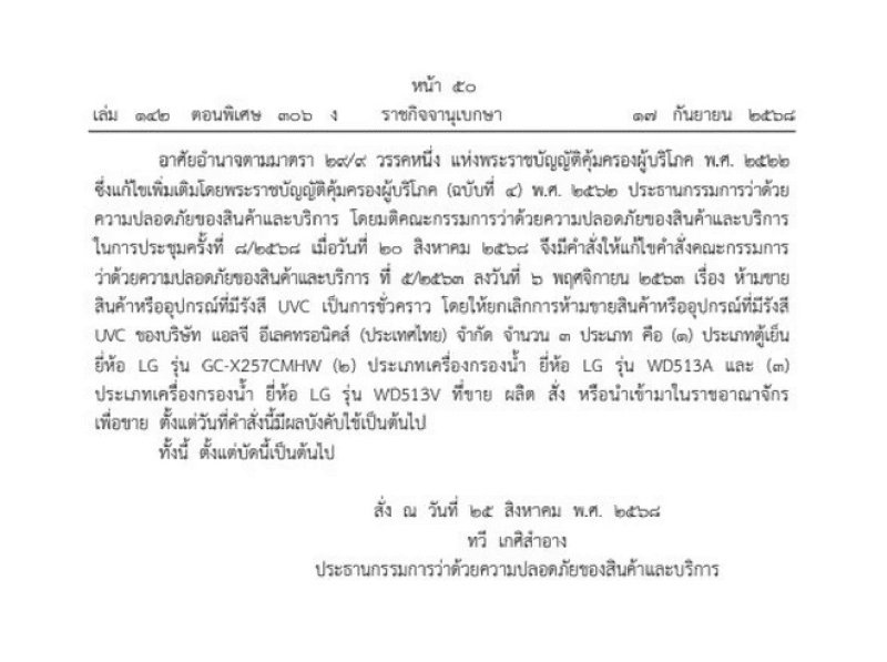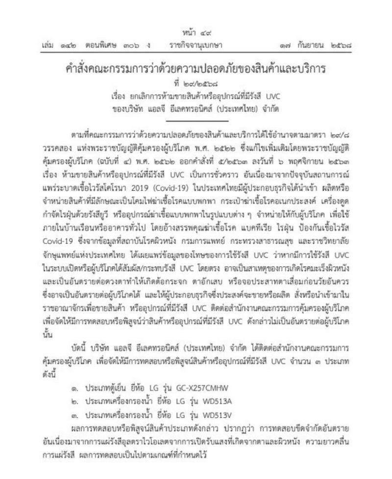 ห้ามขายสินค้าหรืออุปกรณ์ที่มีรังสี UVC เป็นการชั่วคราว โดยให้ยกเลิกการห้ามขาย (ให้ขายได้) สินค้าหรืออุปกรณ์ที่มีรังสี UVC ของ บริษัท แอลจี อีเลคทรอนิคส์ (ประเทศไทย) จํากัด จํานวน 3 ประเภท คือ (1) ประเภทตู้เย็น ยี่ห้อ LG รุ่น GC X257CMHW , (2) ประเภทเครื่องกรองน้ำ ยี่ห้อ LG รุ่น WD513A , (3) ประเภทเครื่องกรองน้ำ ยี่ห้อ LG รุ่น WD513V ที่ขาย ผลิต สั่ง หรือนําเข้ามาในราชอาณาจักรเพื่อขาย ตั้งแต่วันที่คําสั่งนี้มีผลบังคับใช้เป็นต้นไป ทั้งนี้ ตั้งแต่บัดนี้เป็นต้นไป