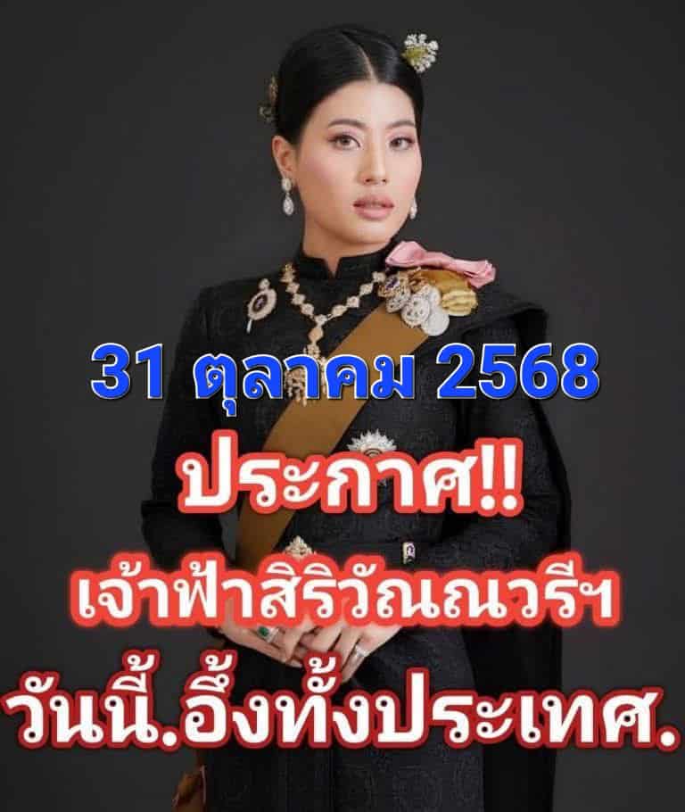 วันที่ 31ตุลาคม 2568 เพจเฟซบุ๊ก HRH Princess Sirivannavari Nariratana Rajakanya ได้เผยแพร่พระฉายาลักษณ์ พร้อมระบุข้อความว่า สมเด็จพระเจ้าลูกเธอ เจ้าฟ้าสิริวัณณวรี นารีรัตนราชกัญญา